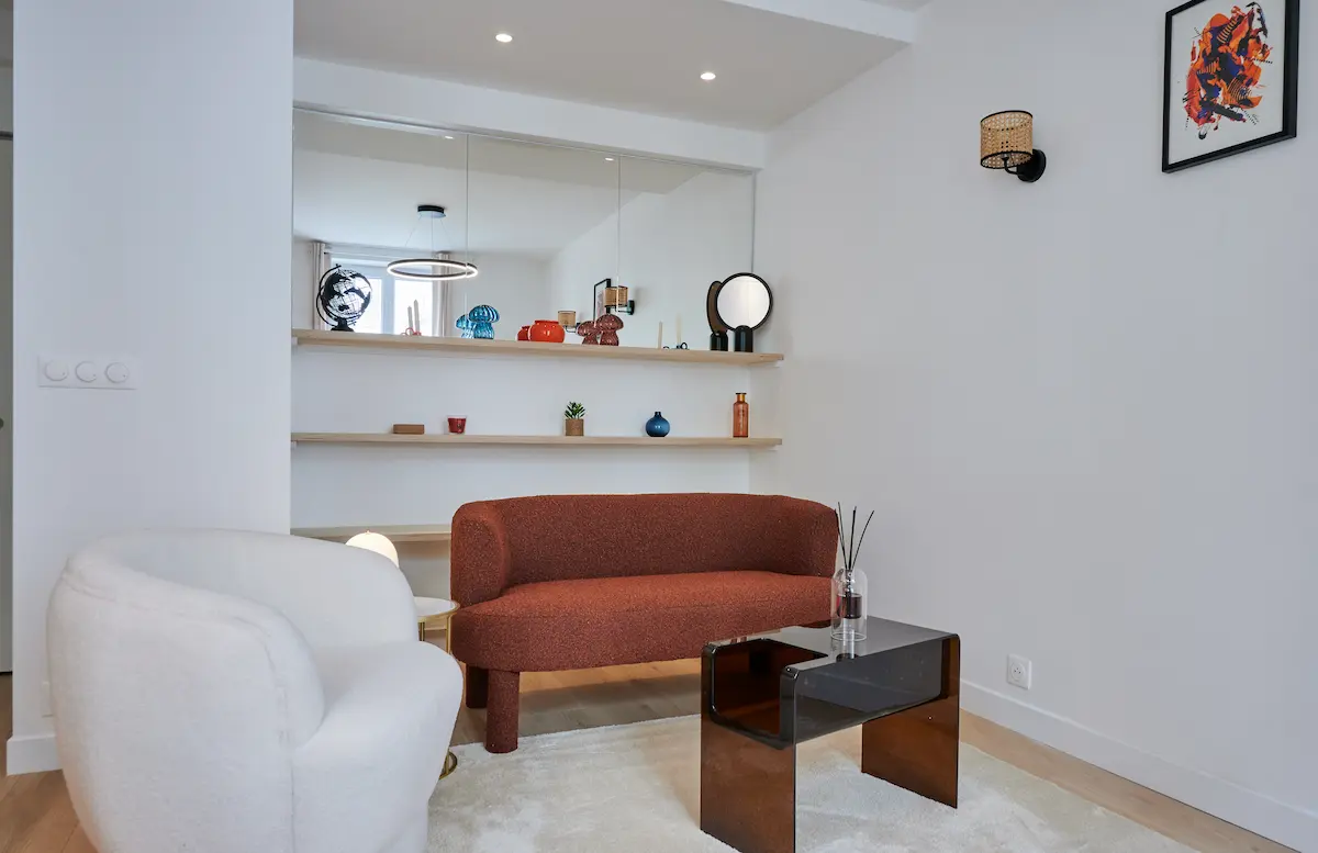 Tout en respectant les codes haussmanniens, nous avons réchauffé l'espace avec des textiles bouclettes et un fauteuil terracotta audacieux.