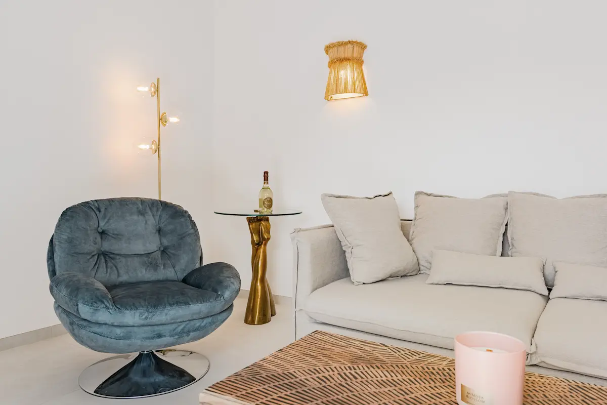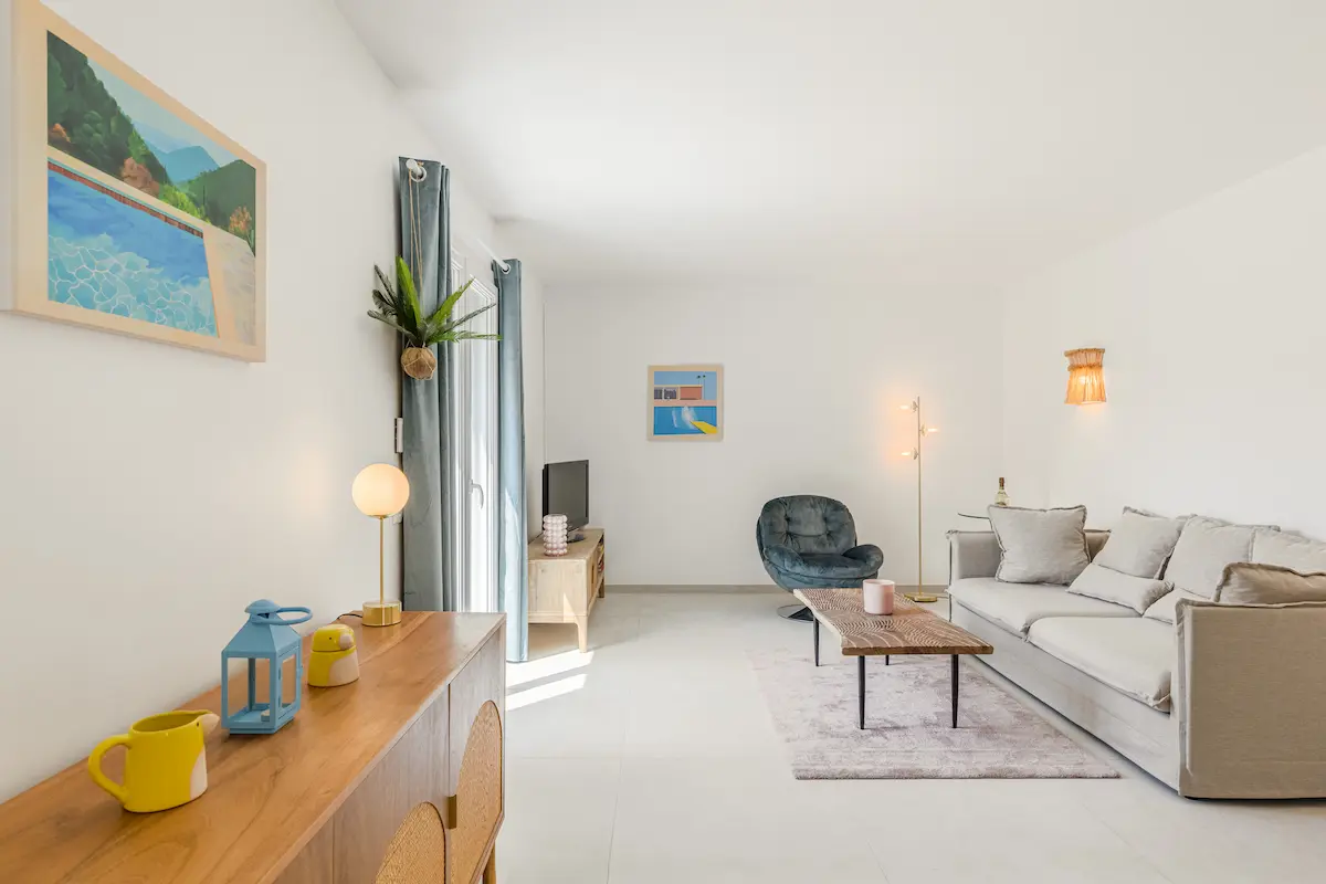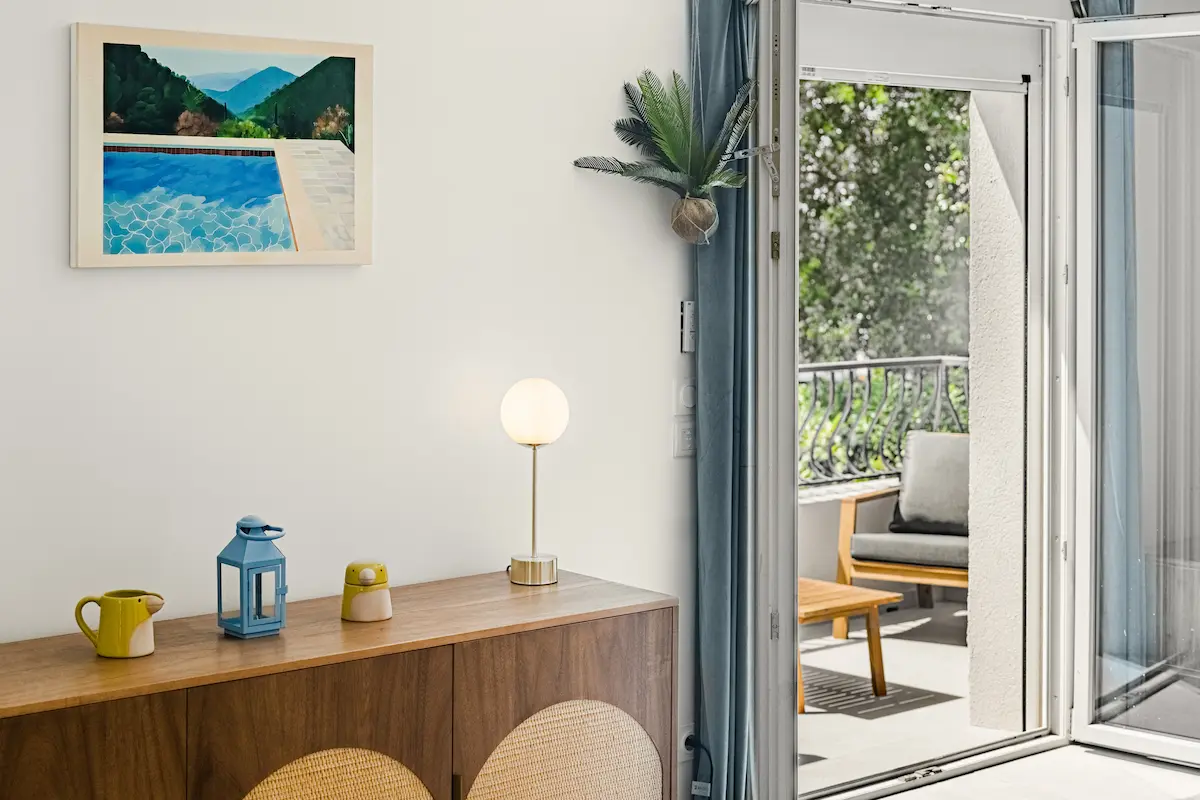 La Solution Mobimmo : Nous avons convoqué la lumière de David Hockney. En jouant sur des aplats de couleurs fraîches (bleu piscine, rose poudré, vert végétal) et un mobilier aux lignes épurées, nous avons créé une ambiance "Palm Springs sur Côte d'Azur". Le sourcing a été chirurgical : des pièces robustes et élégantes, négociées pour maximiser l'effet "waouh" sans exploser le budget.